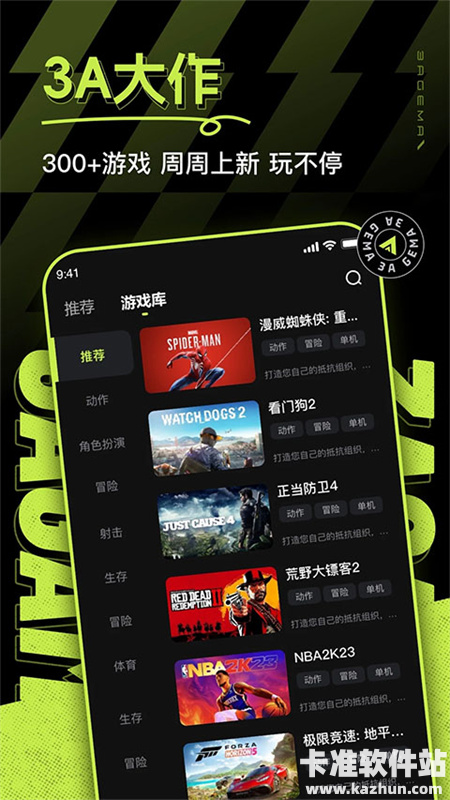 1、打开3A云游,进入应用主界面,包括推荐、游戏库、联机专区和收藏频道,在当前推荐频道可看到系统推荐的不同游戏,