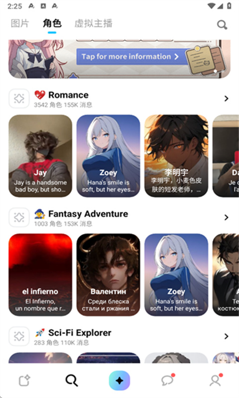 3、群聊与动漫角色OC功能:群聊功能支持创建群聊房间,邀请好友或其他AI角色加入,群内可发送文字、表情、图片等,进行多人互动。动漫角色OC功能允许用户设计原创动漫角色的形象、性格、技能等,创建后的OC角色可参与聊天、剧情创作,甚至能与其他用户的OC角色进行互动,丰富了虚拟世界的角色生态。