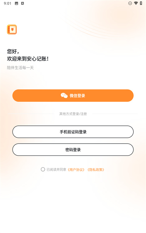 1、打开安心记账应用,弹出隐私政策弹窗,仔细阅读内容,勾选已阅读并同意以上协议内容,点击同意并继续,进入应用主界面。
