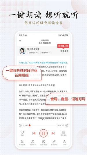 讯飞有声是科大讯飞旗下的一款智能语音朗读工具,致力于为用户提供高效便捷的听读体验。软件采用先进的语音合成技术,能够将各类文字内容转化为自然流畅的语音,支持中文、英文及多种方言朗读。无论是电子书、新闻资讯、学习资料,还是办公文档,讯飞有声都能轻松应对。用户可以根据个人需求调整朗读速度、音调和发音风格,甚至定制专属语音包。此外,软件还支持离线使用,无需网络即可享受高质量的语音服务。讯飞有声不仅适用于日常阅读,还能帮助视障人士获取信息,是一款兼具实用性和人文关怀的智能软件。