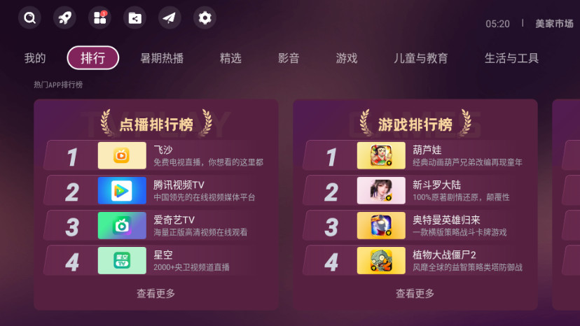 超多精品应用:美家市场软件中收纳近万款专为电视优化的精品应用,堪称电视安装配置的首选之地。