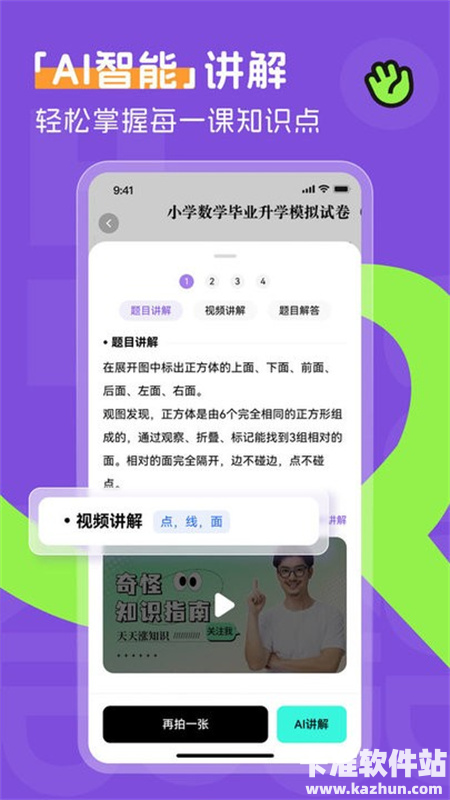 2、支持拍照识别题目,通过互动式讲解帮助学生理解题目背后的知识点。