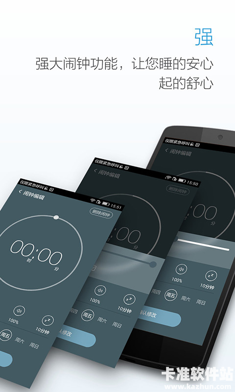 自定义设置,满足您的喜好:闹钟重复周期和贪睡模式设置,让您不会由于想赖床而错过上班时间,铃声和音量的自定义,让您在每一个早晨伴着喜爱的音乐醒来,带来愉悦的心情。