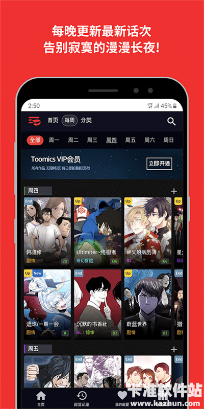 toomics是一款免费看韩漫的应用软件,并且该APP里面的韩漫都已经汉化了,全部都是简体中文,让各位能够看个过瘾,完全不用担心韩文看不懂的问题。不管是目前还在连载还是已经完结的韩漫全都有,并且没有一点删减,完整漫画内容和剧情给各位免费阅读。支持多种翻页模式,能够确保用户在toomics看的开心。