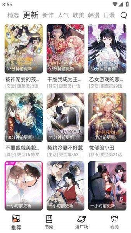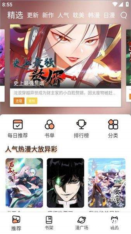 在app首页,我们可以看到精选、更新、新作、人气、韩漫、日漫、欧美等多个板块;