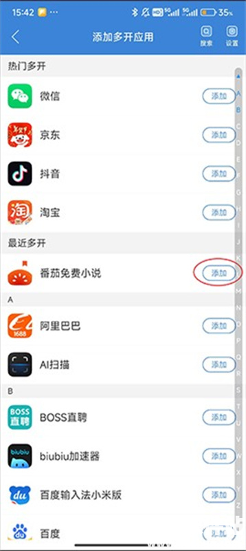 2、在想要多开的应用的右侧点击“添加”。