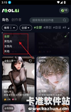 1、进入首页,可以筛选角色,点击全部筛选角色类型