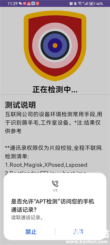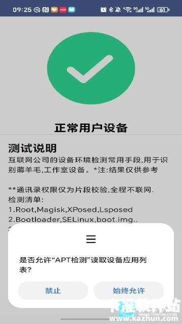 当弹出 “是否允许‘APT 检测’读取设备应用列表” 的权限请求时,根据需求选择 “禁止” 或 “始终允许”,以保障检测功能的完整性。