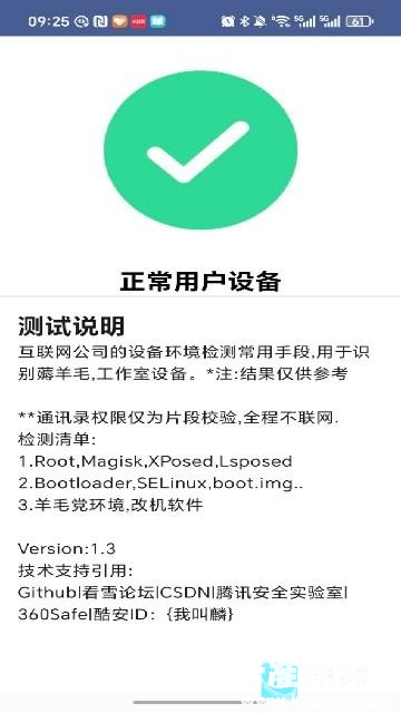 打开 APP 后,可直接查看设备检测结果,如图显示 “正常用户设备”,同时能了解检测说明、检测清单及技术支持来源等信息。
