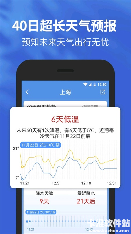 5、40日天气预报:40日超长天气预报,提供未来40天的降温、高温、低温提醒,预知未来天气出行无忧。