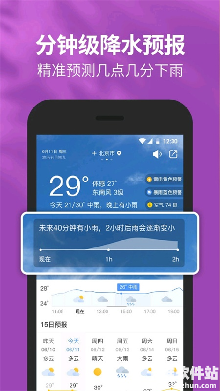1、短时降雨预报:及时预报您所处位置两小时内降雨情况,实时天气降雨提醒,出门、晾衣必备;