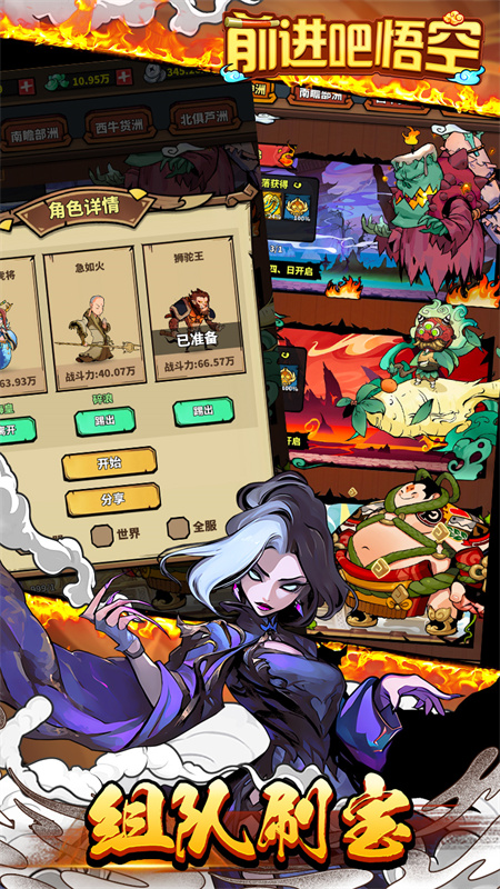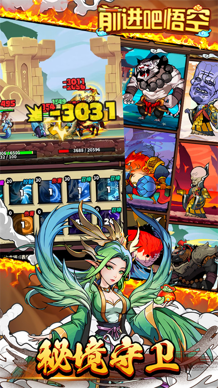 前进吧悟空游戏是一款休闲放置类型的卡牌挂机游戏,在这款游戏之中你将会重新走一次九九八十一难的西行路,感受无比绚烂的3D动作特效,享受畅快无比的战斗体验,各种随心所欲的阵容搭配以及丰富多彩的系统副本,都会给你不一样的游戏体验。前进吧悟空游戏之中你需要在面对各种不同属性的敌人的时候保持冷静,通过完美的阵容组合来享受无比顶级的游戏体验,成为一位天命之人吧。