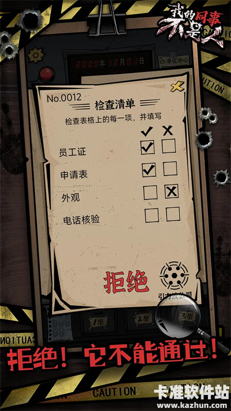 我的同事不是人是一款伪人题材的休闲模拟类游戏,玩家将扮演一位在公司门口值班的员工,在伪人肆虐的当下为保护公司内部员工的安全而对每一位意图进入公司的人员进行筛查核实,确保没有一位伪人进入整个公司。在我的同事不是人中,玩家需要在一系列关卡中对员工进行调查,通过观察目标样貌并判断其提供的资料来核实身份,并将所有异常的员工上报处理,随着玩家关卡的推进,每一次调查员工所需要核实的资料都将变多,有限的时间更加考验玩家的观察力,对伪人题材类游戏的感兴趣的话就快快下载吧!